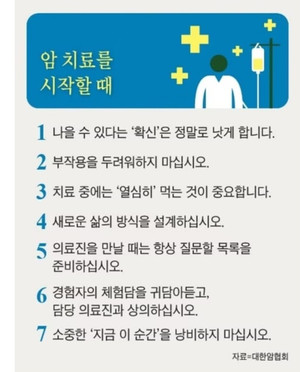 부고가 날아든다. 부모님뿐만 아니라 본인 사망이나 배우자 사망 소식도 적지 않다. 노환으로 돌아가신 분도 있지만 낙상 후 폐렴으로 세상을 떠난 분도 있고 암으로 사망한 사람도 많다. 암 진단을 받고 충격에 빠져 길고 긴 치료 과정을 버텨내야 하는 환자가 가장 고통스럽겠지만 그 과정을 지켜보면서 간병해야 하는 가족의 고통도 극심하다.대한암협회가 암 진단을 받았을 때, 그리고 암 치료를 시작할 때 환자와 가족이 알아야 할 수칙 열네 가지를 제시해 눈길이 갔다. 무엇보다 암 진단을 받은 환자의 심리 상태를 세심히 살펴 정서적인 안정을 찾