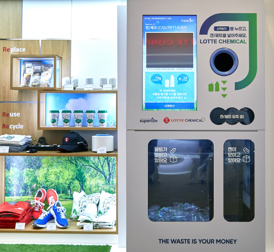 롯데케미칼은 지난 3월 프로젝트 루프를 개시했다. 프로젝트 루프는 롯데월드몰, 롯데월드, 롯데마트에서 폐플라스틱을 수거한 뒤 친환경 소재 원사, 원단을 뽑아 신발이나 가방 등을 만드는 프로젝트다.